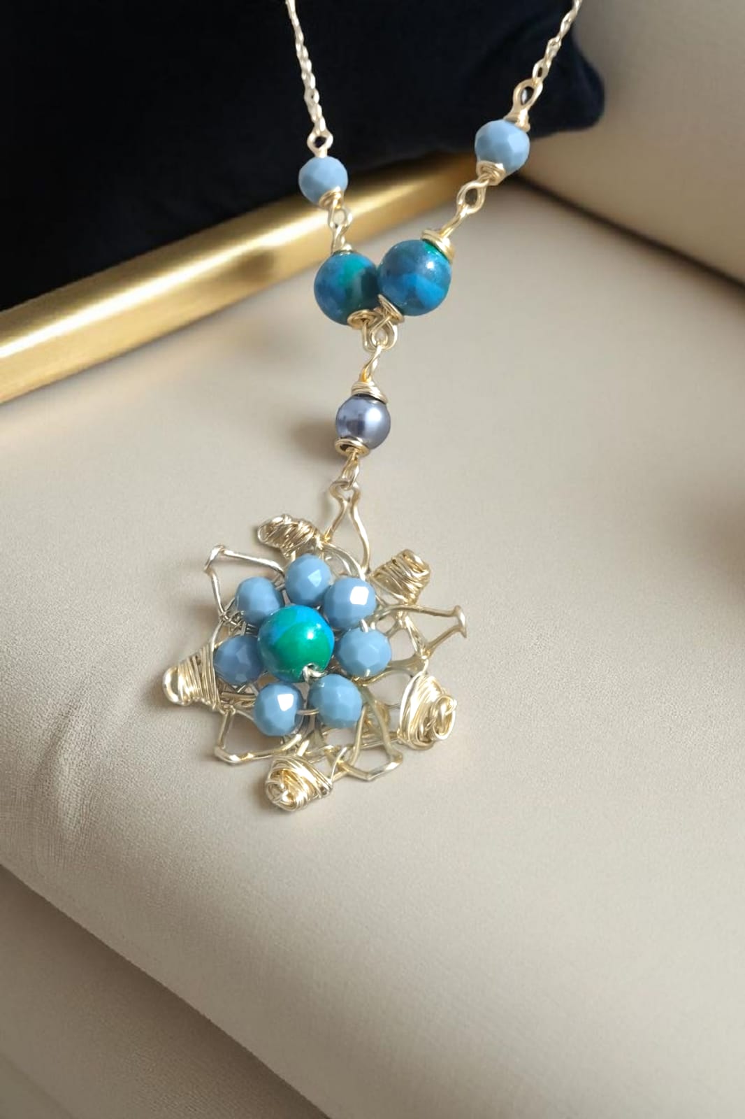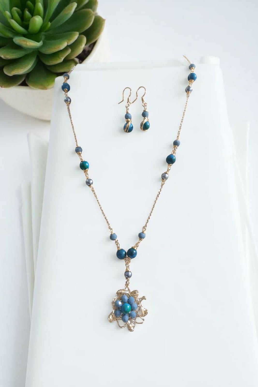 Flor del Verano es una joya artesanal que captura la esencia de lo natural y lo sofisticado. Este collar ha sido elaborado con delicada chapa de oro, acompañado de perlas Mallorca, cerámicas cuidadosamente seleccionadas y destellos de cristales finos. Su pieza central, una flor creada con la técnica de alambrismo, está inspirada en la belleza única de las suculentas, simbolizando fortaleza y elegancia en un solo diseño, mide 50cm de largo. Aretes 2 cm de largo.